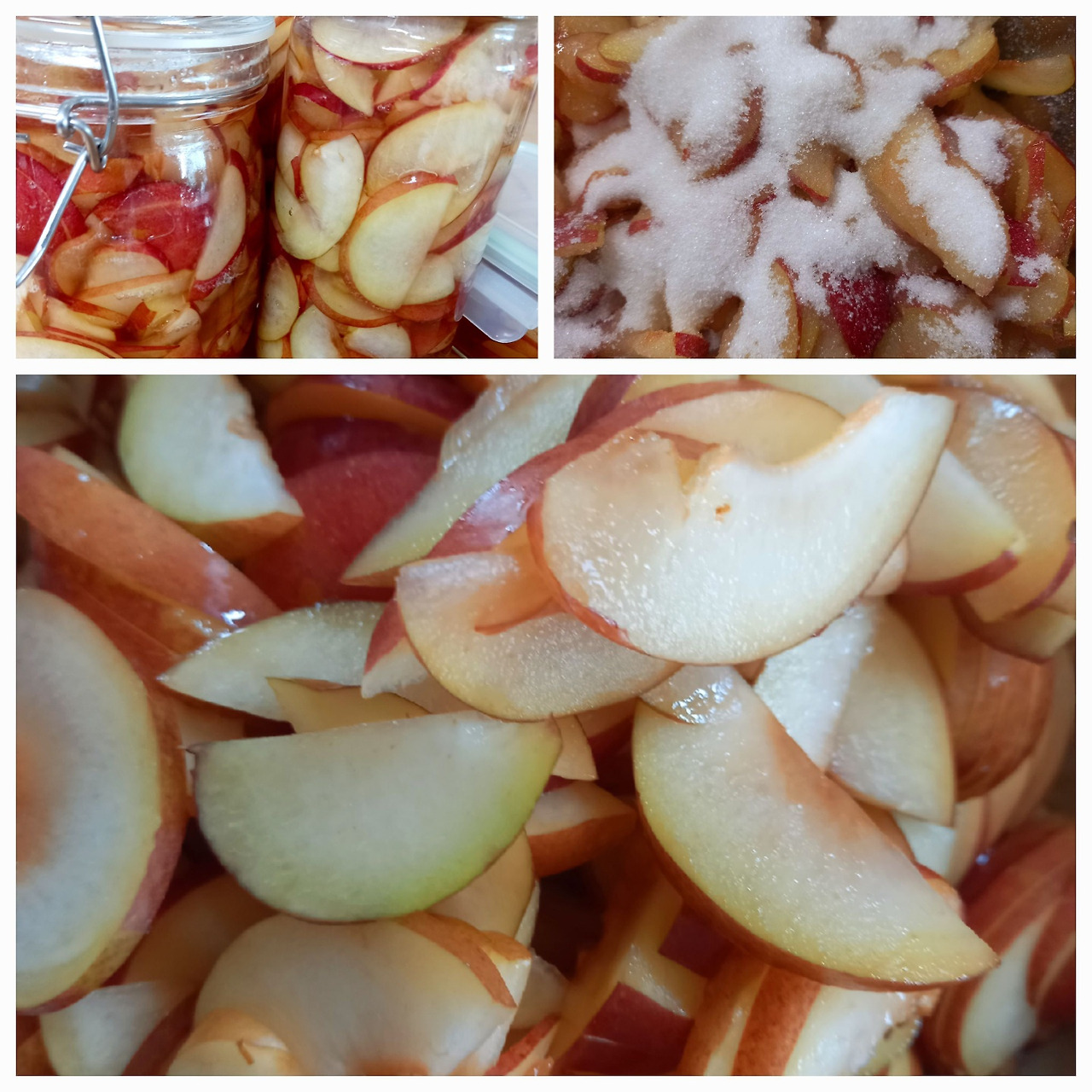손으로 조물 거리고 다시 한번 설탕을 부어주었다. 어느새 하얀 설탕은 자두 속으로 녹아들어 물이 생기기 시작했다. 뜨거운 물에 소독한 유리병 세 개와 사각 유리통에 청이 담겼다.