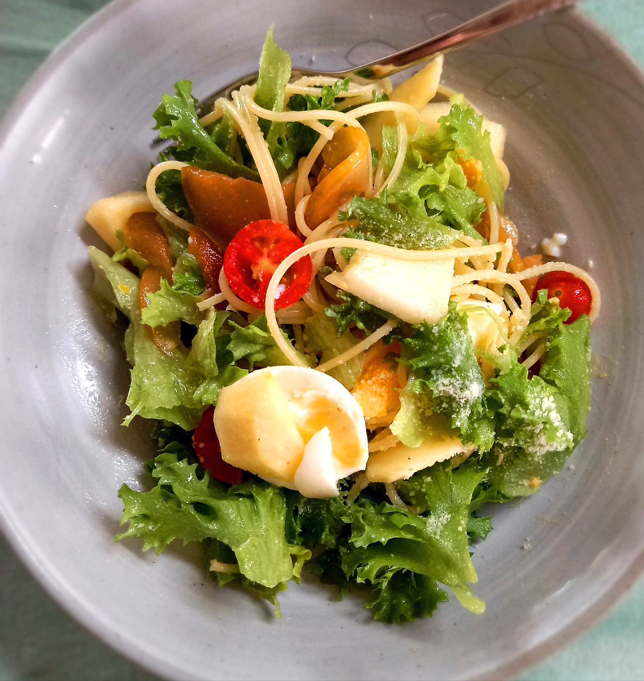 집 안을 정리하고 11시 반이 훌쩍 지날 무렵부터 조리했다. 파스타면과 달걀을 준비하는 데 10분이 채 걸리지 않았다. 나머지는 씻고 썰어두기만 하면 끝이다. 소스는 무얼 할까 고민하다 올리브유와 매실청에 소금을 조금 넣고 들깻가루를 더한 다음 휘휘 저었다. 마지막으로 파르메산 치즈 가루를 뿌려주었다.