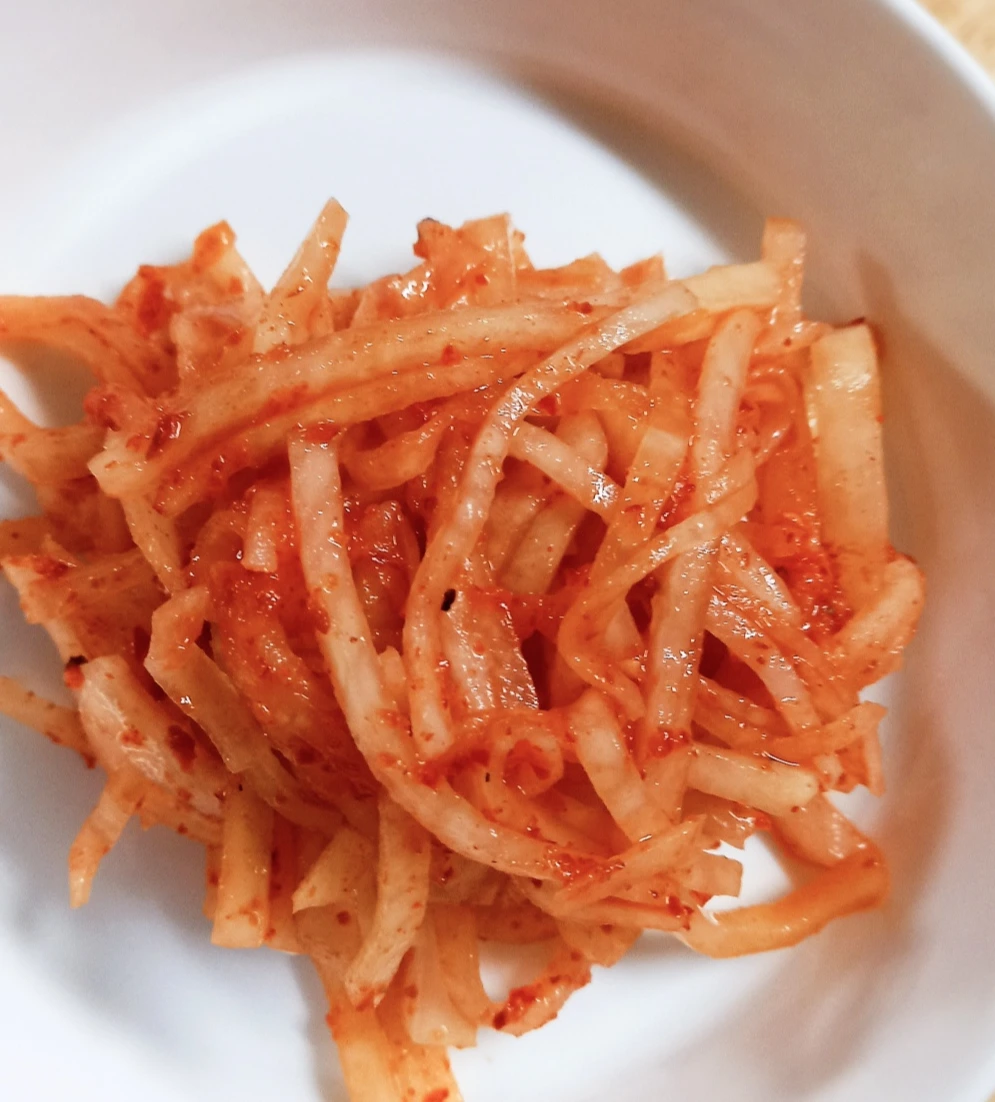 올해 처음으로 산 가을무로 무생채를 만들었다. 무 하나를 들고는 무청을 잘라내고 씻은 다음 껍질을 벗기고 채를 썰었다. 멸치 액젓과 매실청을 조금 넣었다. 언제가 만들어 둔 냉장고 깊숙한 곳에서 잠자고 있는 김치 양념을 꺼내어 버무리기 직전에 식초를 조금 떨어트린다. 이 과정을 거치면 어색한 액젓향대신 새콤함과 더불어 깔끔한 뒷맛을 전한다.