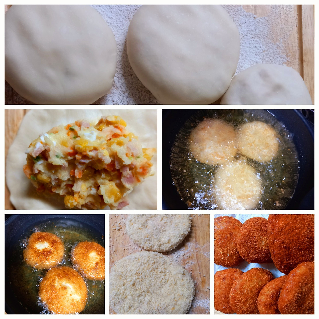 점심 모임을 다녀온 오후 3시 무렵부터 만들기 시작했다. 빵 형태로 만든 다음 튀겨내기에 반죽을 준비했다. 밀가루와 미지근한 물, 이스트와 설탕 소금, 식용유를 잘 섞은 다음 30분을 따뜻한 곳에 두었다. 다시 잘 발효된 반죽을 꺼내어 8개 둥근 빵을 만들고, 15분을 두었다가 소를 담았다.