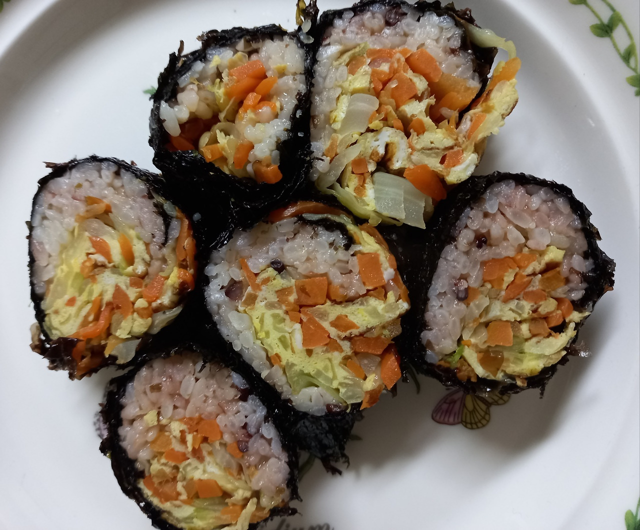 양배추와 당근을 채 썰고 동백기름에 소금을 조금 넣고 볶은 다음 달걀물을 부었다. 적당한 크기의 전이되자 그것을 밥이 아주 조금 들어간 김 위에 올렸다. 그리고 돌돌 말았다. 더 이상 무엇을 넣어야겠다는 마음이 처음부터 없었다. 대충 썰어놓은 김밥 8조각은 점심식사로 충분했다.