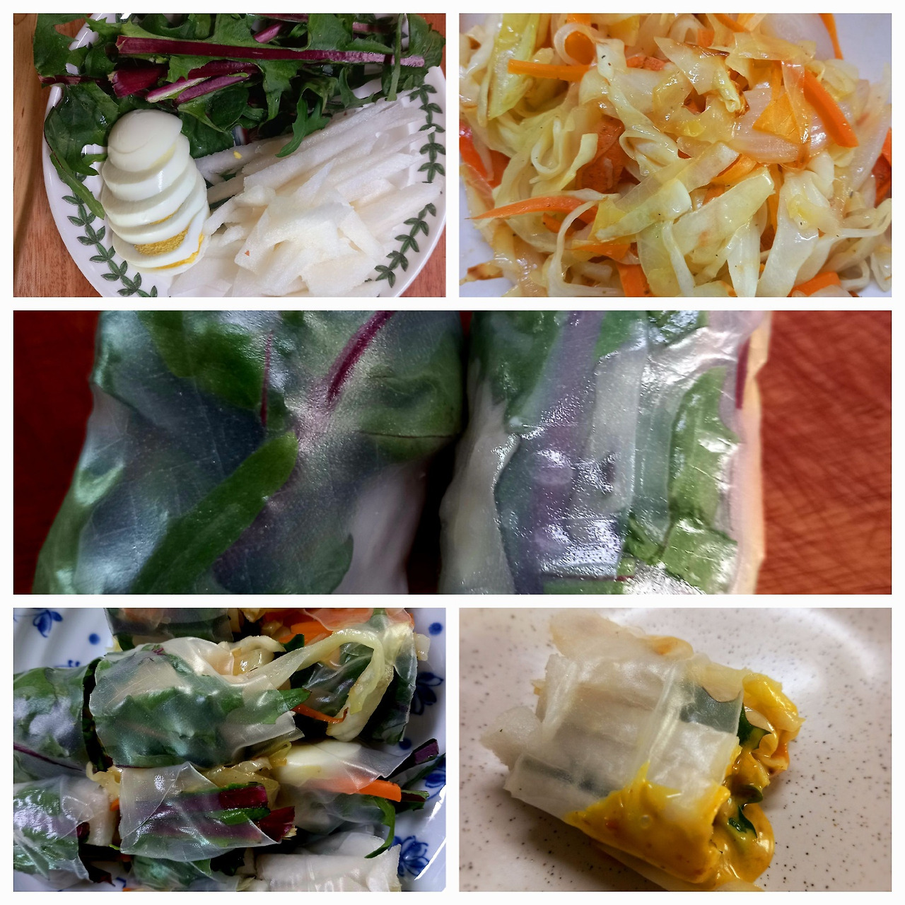 양배추와 양파, 당근은 동백기름에 살짝 볶았다. 배를 채 썰고 엄마가 보내준 적색 치커리, 삶은 달걀 하나를 썰었다. 미지근한 물에 라이스페이퍼를 담갔다 꺼낸 후에 재료를 차례로 놓고 돌돌 말면 끝이다. 그렇게 몇 개를 만들었다. 소스는 간단하게 머스터드소스에 매실청을 아주 조금 넣었다. 그동안 해보지 않은 조합이었지만 괜찮다.