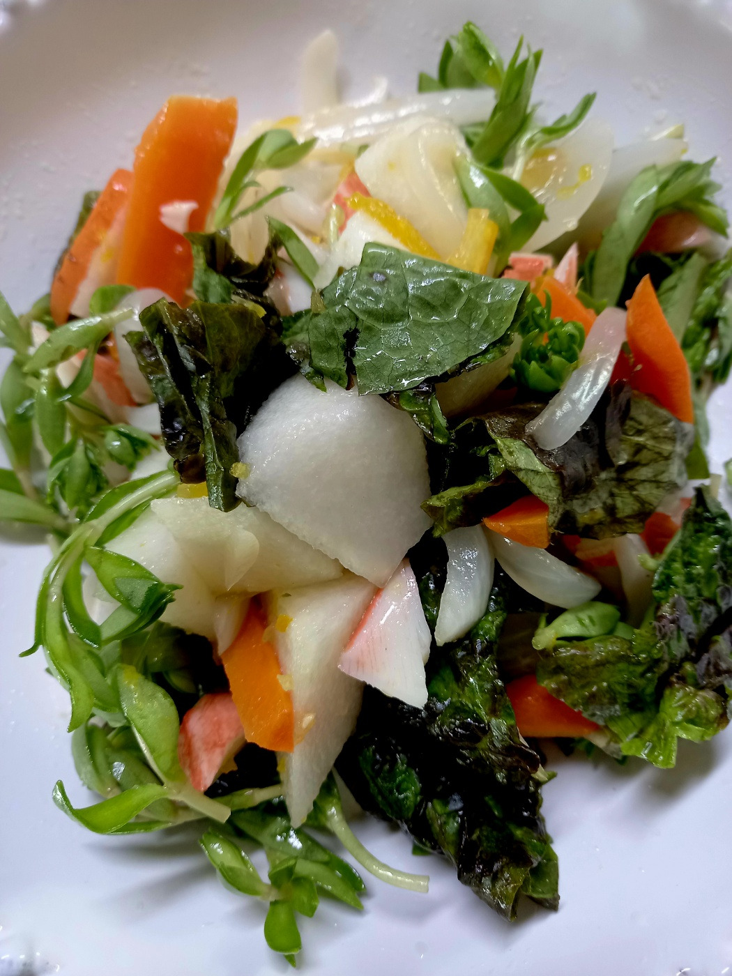 어떤 맛일지 좀처럼 짐작할 수 없다. 그저 내가 만든 것이니 괜찮다는 긍정적인 신호를 보낸다. 맛을 보니 생각보다 훌륭하다. 풋풋한 풀향이 별로인 돌나물과도 합이 좋다. 유자청의 진한 향 앞에서 돌나물의 기세가 약해졌는지 아니면 친구가 되었는지 모르겠다. 배는 아삭하다. 당근과 양파도 낯설지만 나름 어울린다.