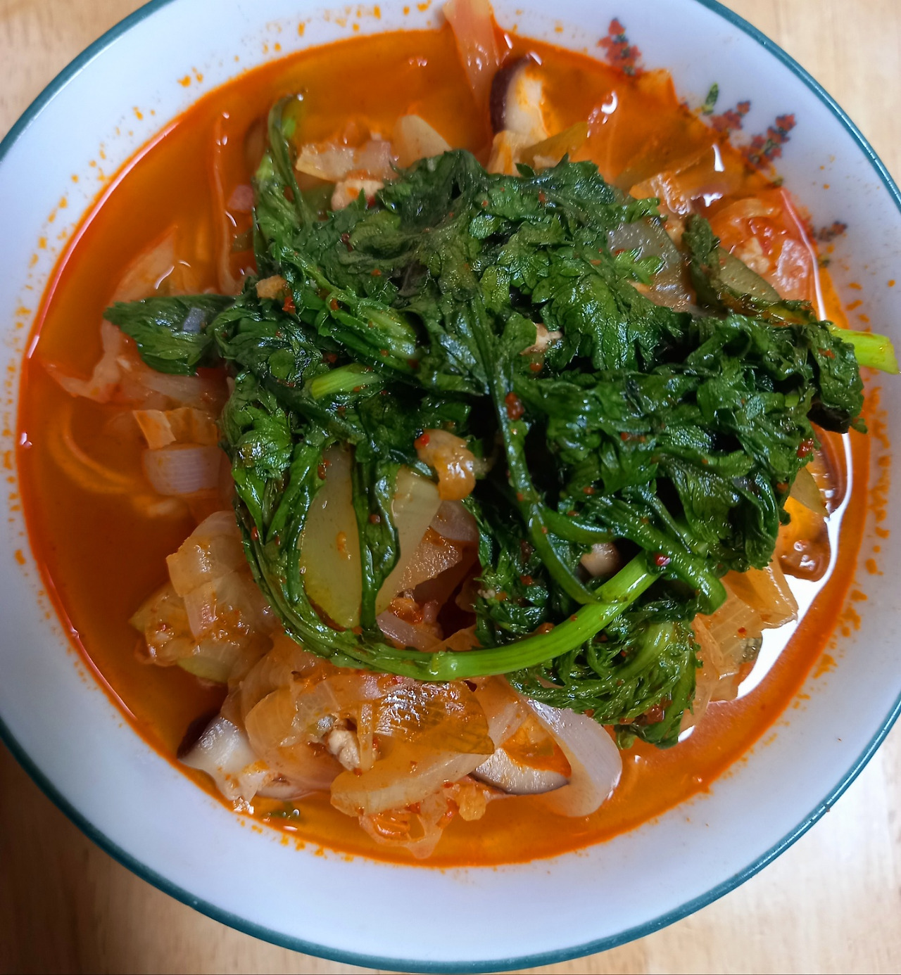 팬에 기름을 두르고 다진 마늘을 넣고 볶다가 대파에 이어 고춧가루 세 숟가락을 넣고는 매운맛이 나도록 했다. 이 과정이 끝나면 고기를 충분히 익혀주고 채소를 담고 물을 충분히 부은 다음, 한소끔 끓여준다. 육수를 따로 만들지 않아서 집 간장과 참치 액으로 간했다.