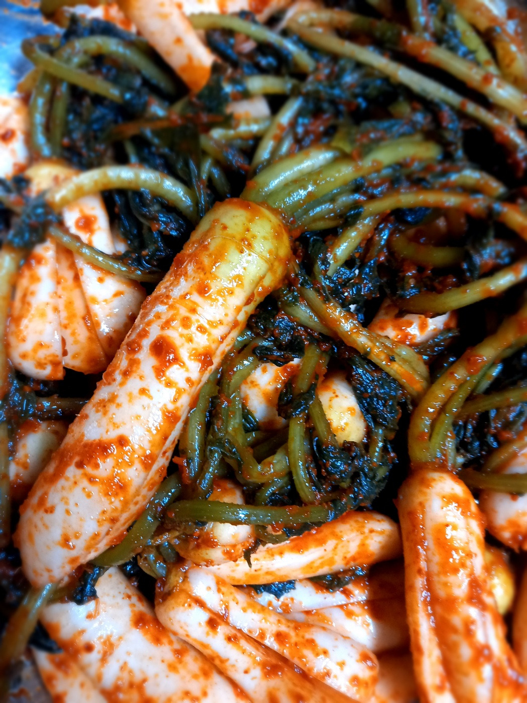 그런 다음 멸치와 디포리로 만든 육수에 배와 마늘을 간 것, 멸치액젓과 고춧가루, 매칠 청을 넣고 양념을 만들어 두었다. 이렇게 김치 준비가 끝났다. 그리고 다음 날 새벽 5시 무렵 눈이 떠졌다. 이제 알타리김치 만들기의 종점을 향해 빨리 움직였다.