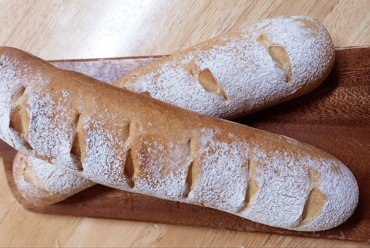 보통은 한 시간 정도로 하는데 그 시간을 훌쩍 넘겼다. 내 느낌에 다 되었다 여겼을 때 꺼내어 가스를 빼고는 두 덩어리로 나누었다. 그것을 긴 바게트 모양으로 만들어 두 배정도 부풀게 두었다.
