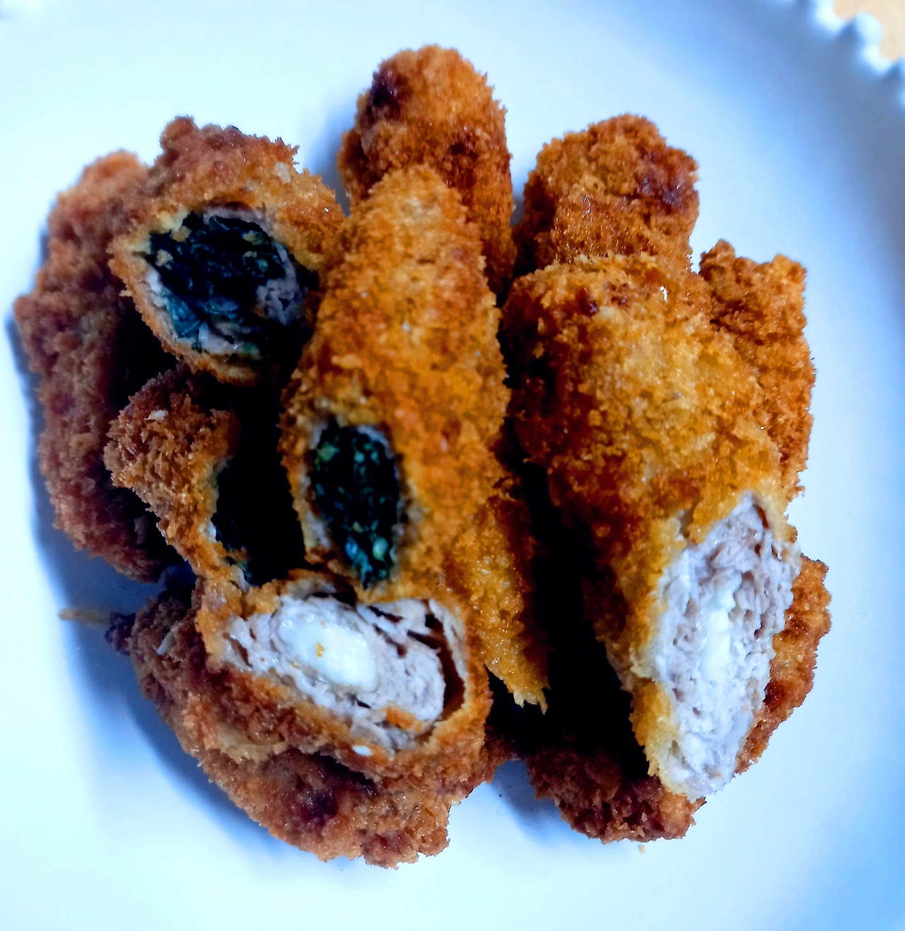 어느새 접시 가득 적당히 길고 뭉뚝한 돈가스 완성이다. 갈색을 살짝 보이는 그건 보기만 해도 맛을 짐작하고도 남는다. 하나를 들어 가위로 잘라보니 고기 안에 흰 치즈와 초록이 단단히 자리 잡았다.