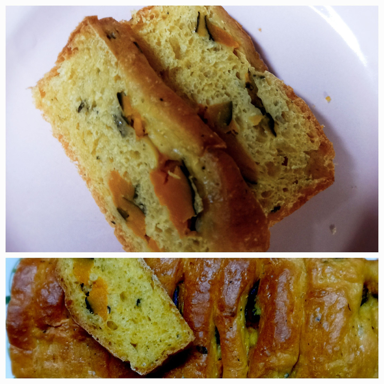 빵이 완성되었다. 단호박이 어떤 모양인지 궁금해서 한 조각을 썰었더니 진 청록의 껍질과 주황 단호박이 콕콕 박혔다. 처음에는 단호박으로 식빵을 두 번째는 파운드케이크를, 그리고 롤 빵까지 만들었다.