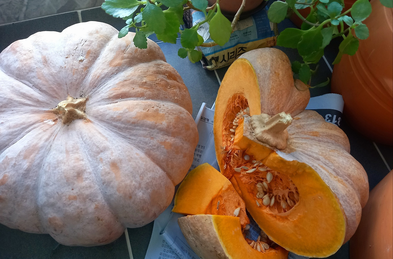 크기만 해도 상당하다. 호박을 들기 위해선 당연히 양손을 사용해야 한다. 한쪽을 잘라서 요리하기 시작하면 호박을 잘 먹겠다는 일종의 다짐이 필요하다. 호박을 먹는 일이 뭐 그리 대단한가 싶지만, 양이 상당해서 적당한 간격으로 요리를 해야 하는 부지런함이 필요하다. 그렇지 않으면 며칠은 싱싱한 것 같아도 시간이 갈수록 예쁜 색을 잃어버릴 뿐만 아니라 썩어서 버려야 한다.