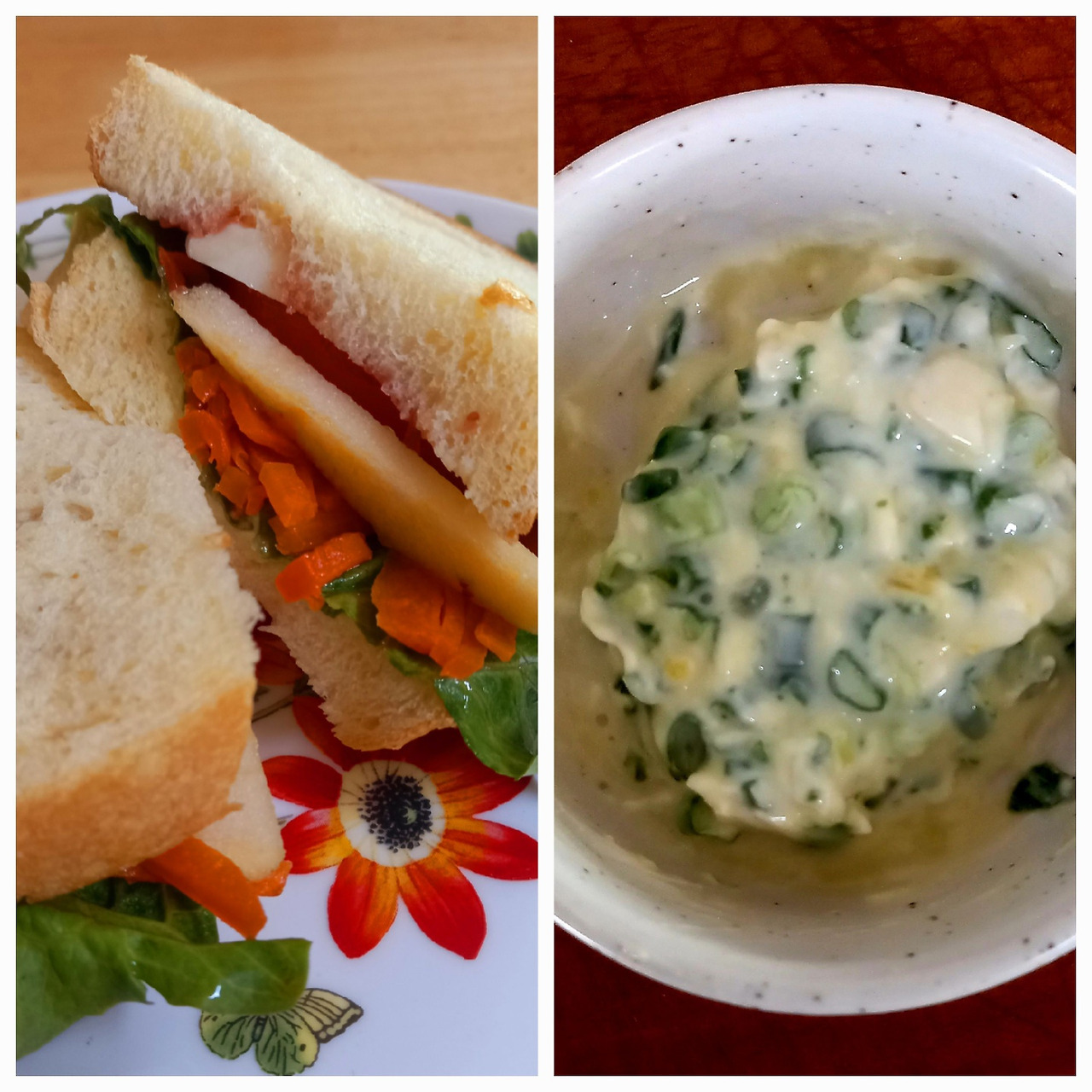 이번에는 쪽파 크림치즈를 만들기로 했다. 이름처럼 쪽파 서너 가닥을 다지듯이 가늘게 채를 썰고 나서 크림치즈와 섞었다. 혹시나 파 맛이 강할 것 같아 꿀 한 티스푼도 더했다. 이 과정이 끝나자 바로 식빵 두 조각을 구웠다. 빵 한편에 쪽파 크림치즈를 바르고 좋아하는 당근 볶음을 가득 올렸다. 상추와 사과, 치즈 순으로 차곡차곡 쌓아 샌드위치를 만들었다. 간간이 쌉쌀한 듯하면서도 고소한 파 향이 올라온다.