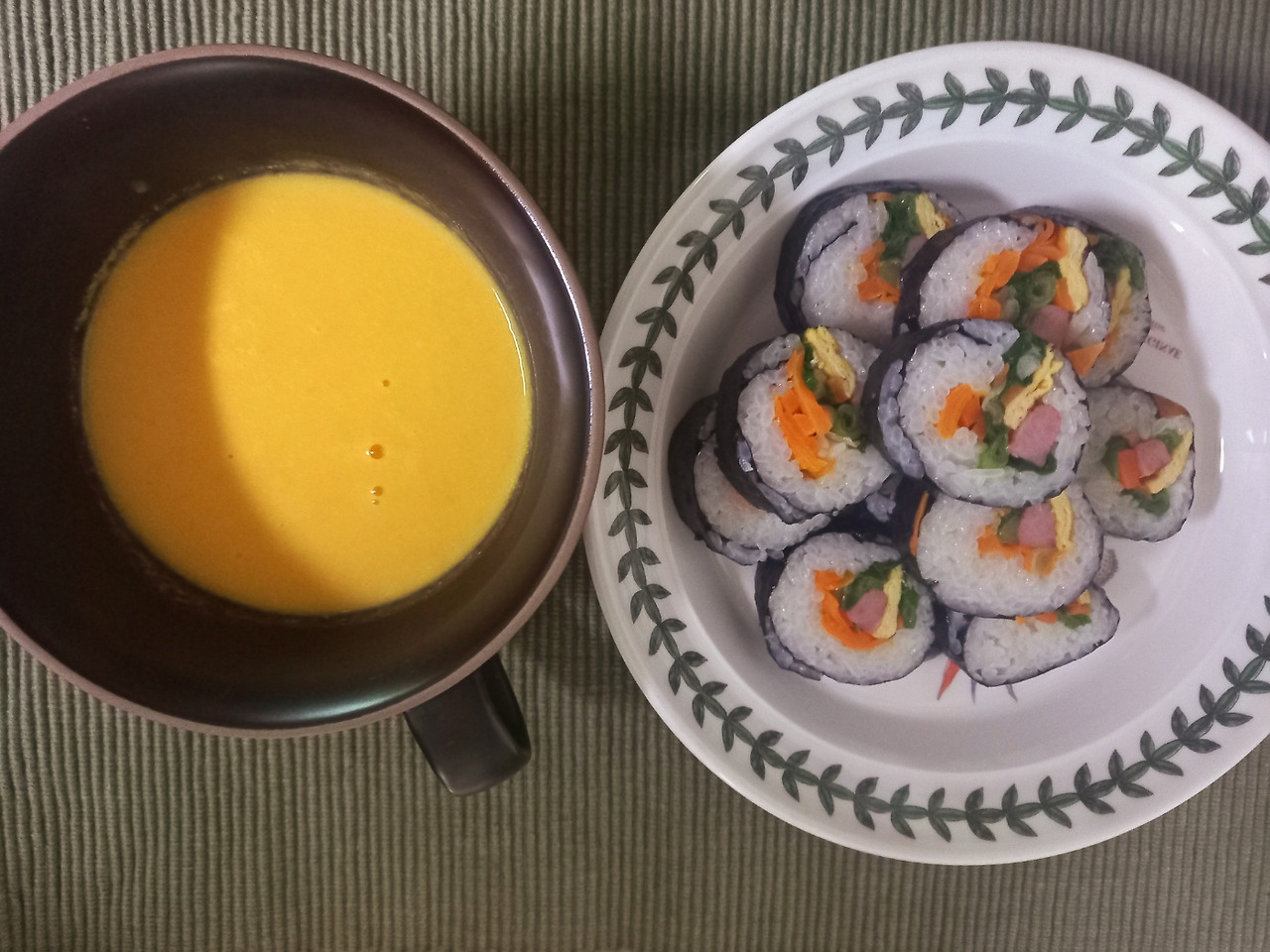 그렇게 한 주를 보내고 집에서도 만들었다. 적당히 썬 당근과 양파를 올리브유에 볶은 다음 생크림과 우유를 넣고 끓이다가 블렌더로 갈았더니 점차 노란색으로 변했다. 수프 옆에는 방금 만든 김밥이 있다. 둘은 가벼움과 적당한 무게감으로 서로를 보완해 주며 어울렸다.