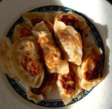 만두 여덟 개를 가지고 군만두 만들기에 나섰다. 팬에 적당량 기름을 넣고 약한 불에서 익혔다. 어느 음식이든 불 조절이 중요하지만 특히 만두는 센 불에서는 금방 타버린다. 갓난아기를 다루듯 천천히 시간을 두었다. 아랫면이 노릇노릇 익어간다는 신호를 보내면 반대편으로 뒤집는다. 그리고 화룡점정처럼 맨 마지막에 해줘야 할 일이 있다. 촉촉하고 바삭한 맛을 원하기에 빼놓을 수 없다. 녹말가루 한 숟가락에 세 배 정도의 물을 넣어 잘 섞이게 하고 만두 위에 뿌려준다. 자칫 딱딱해지는 만두피가 적당한 수분을 머금어 부드러우면서도 아삭한 맛과 속 재료가 고루 익는 촉진제 역할을 한다.