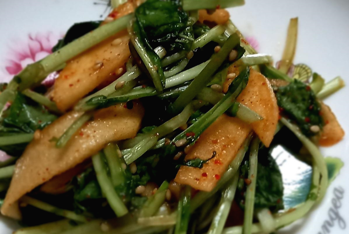 아 참 잊고 있었다. 어제저녁에 만들어 놓은 유채 겉절이도 함께 올렸다. 유채 하면 고향 제주도의 봄이 그려진다. 3월을 보내고 4월 중순에서 5월 어느 즈음까지 섬을 수놓는 노란 물결의 주인공이다. 큰 키를 자랑하며 바람에 살랑거리는 모습은 파란 하늘과 함께 빼놓을 수 없는 풍경이다. 지난 금요일 동네 로컬푸드 매장에서 우연히 유채를 보는 순간 기뻤다. 이국 타향에서 동네 이웃을 우연히 만난 것 같은 기분과 비슷하지 않을까 싶다. 망설임 없이 장바구니에 넣었다. 하루를 보내고 주말 저녁에 사과와 함께 간장 소스에 버무렸다. 간장과 식초, 매실, 참기름 한 방울과 깨소금을 넣었다. 아삭하면서도 싱그러운 풀향과 부드러운 맛이 일품이었다. 볼수록 기분 좋아지는 음식이었다.