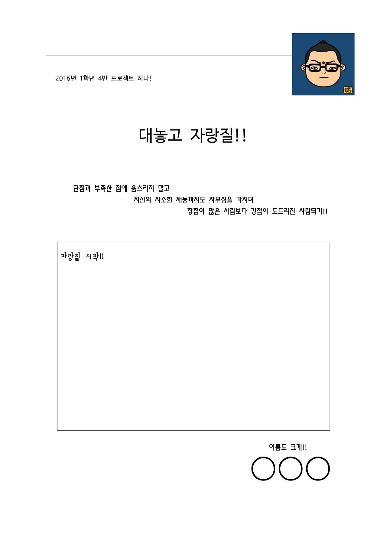 그렇게 '대놓고 자랑질'을 잘하긴 하지만 굳이 첫 소개에 대놓고 자랑질을 한 이유는 우리 반 아이들 또한 대놓고 자랑질을 잘했으면 하는 이유였다.