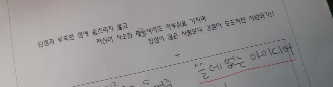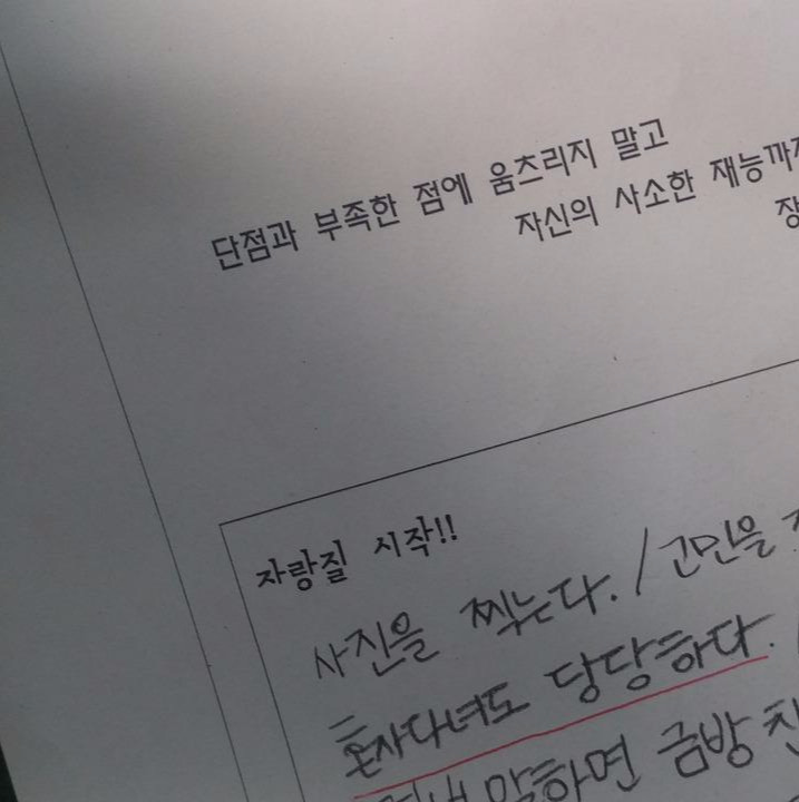 입학 면접을 볼 때도 그리고 OT에서 각자 자기소개를 할 때에도 스스로의 지난 중학교 생활과 현재의 자기의 모습에 불안과 후회가 가득 남긴 눈물을 흘리는 아이들이 있었다. 내가 보기에는 충분히 열심히 잘 살았음에도 불구하고... 그리고 이제 17살이 된 아이들이, 마냥 즐겁고 신나야 할 아이들이 무슨 인생의 회한이 있는지 지난 중학교의 생활을 후회하고 '자기반성'의 강도가 너무 높아 보이는 언어들을 사용하고 있다. 그래서 내 소개가 끝나고 반 아이들과 함께 '대놓고 자랑질 하기'를 해보았다.