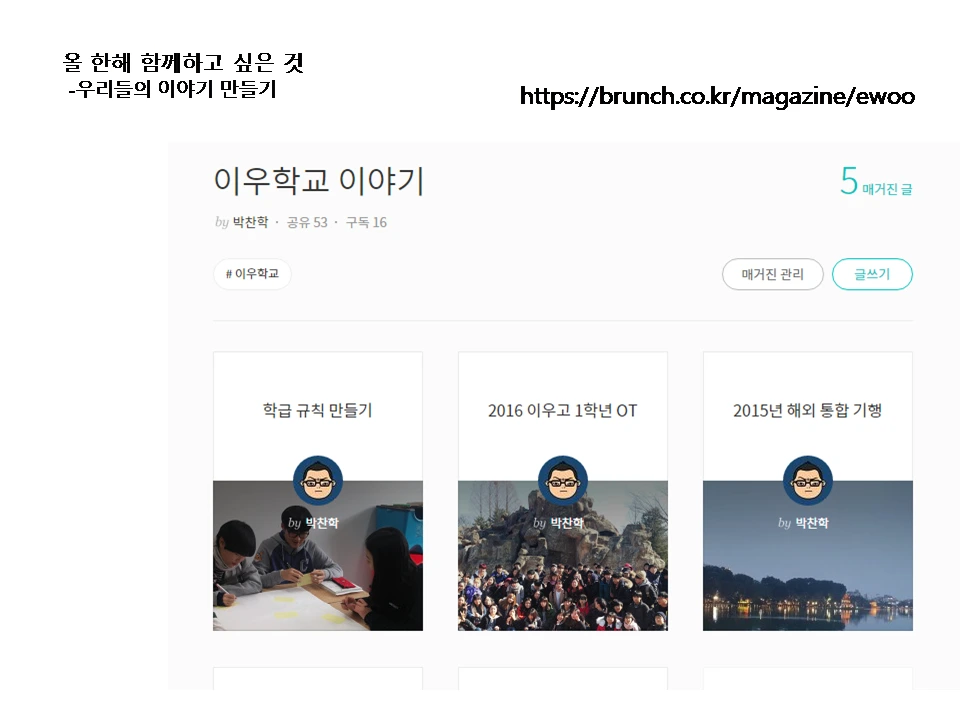 아이들에 이 브런치를 알려주고 설명해주었다. 그리고 아이들에게 (브런치 작가가 돼서) 우리의 일 년간의 이야기를 함께 담아내고 학년이 끝날 때 즈음 '브런치북'에 도전해보자고 했다. 아이들의 반응은 좋았으나 일 년간의 우리의 이야기를 함께 담아내는 것보다 우리 반 아이들이 브런치 작가가 되는 게 더 힘들 듯하다.