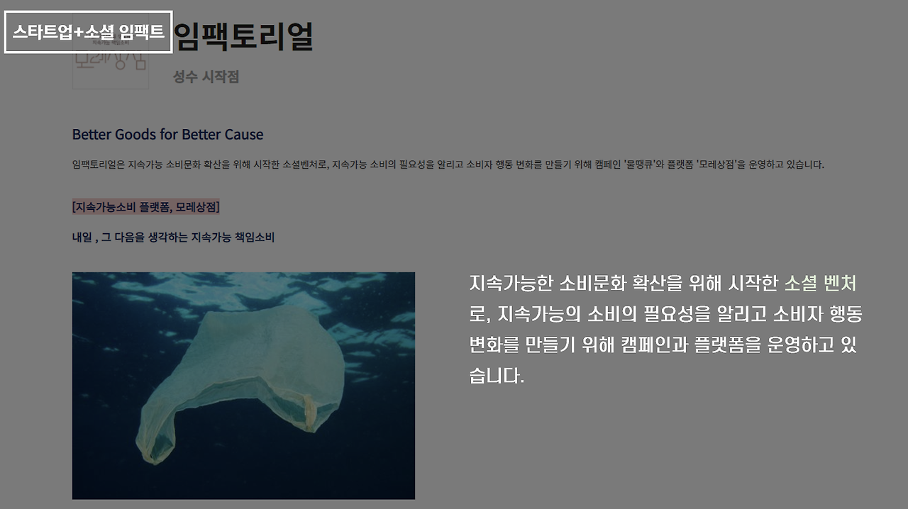 제가 제시한 홈페이지 이미지를 자세히 보시면 소셜벤처나 소셜 임팩트라는 단어들이 많이 등장하는데요 이건 뒤에 더 구체적으로 살펴보겠습니다.