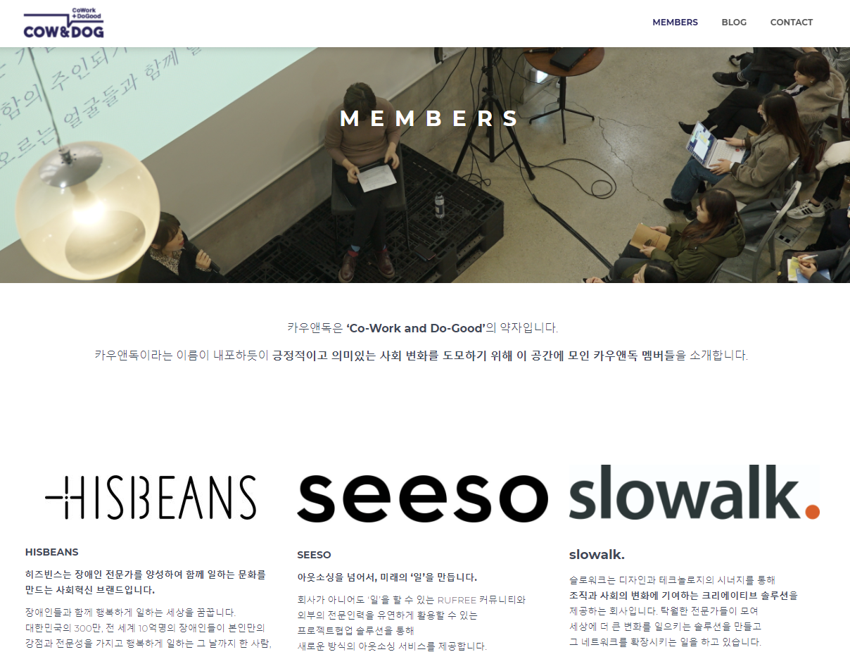 COW&DOG은 CO-WORK and DO-GOOD이라는 의미의 약자입니다.