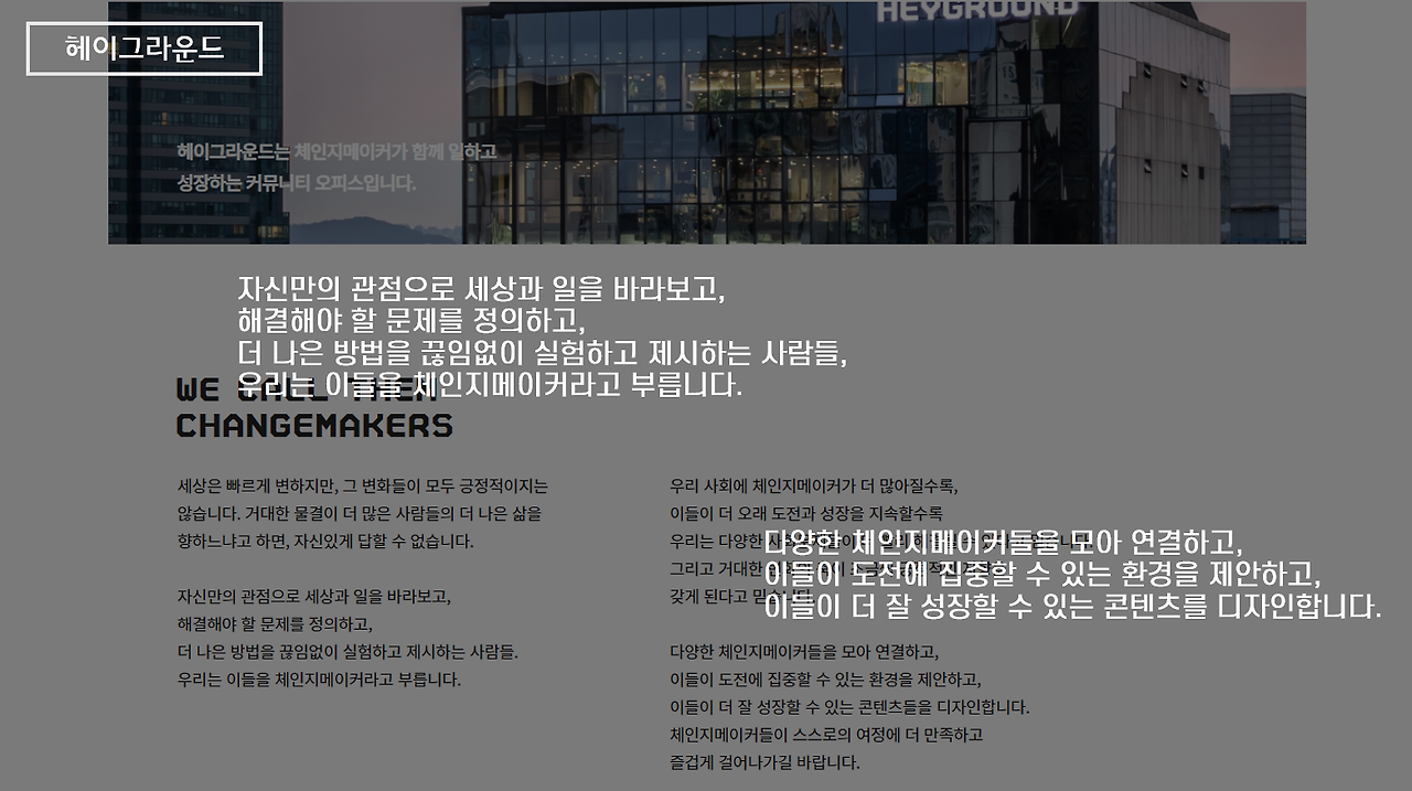 헤이그라운드의 홈페이지에는 “자신만의 관점으로 세상과 일을 바라보고, 해결해야 할 문제를 정의하고, 더 나은 방법을 끊임없이 실험하고 제시하는 사람들, 우리는 이들을 체인지메이커라고 부릅니다. 다양한 체인지 메이커들을 모아 연결하고 이들이 도전에 집중할 수 있는 환경을 제안하고 이들이 더 잘 성장할 수 있는 콘텐츠를 디자인합니다”라고 공간 소개가 되어 있습니다.