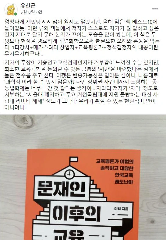 이 페이스북을 운영하는, 제자이니 편하게 이름을 부르겠습니다. 찬근이는 “저자의 주장이 기승전 고교학점제인지라 거부감이 느껴질 수는 있겠지만 최소한 교육개혁을 논의할 수 있는 공동의 지반을 마련했다는 점에서 높은 점수를 주고 싶다‘고 평했습니다.