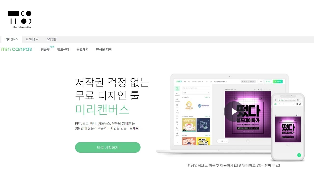 저작권 걱정 없는 무료 디자인 툴 서비스 제공해주는 미리 캔버스라는 사이트가 대표적인데요, 기본적인 틀을 선택하고 텍스트 몇 개만 바꿔도 저작권 걱정 없는 디자인 결과물을 가질 수 있습니다.
