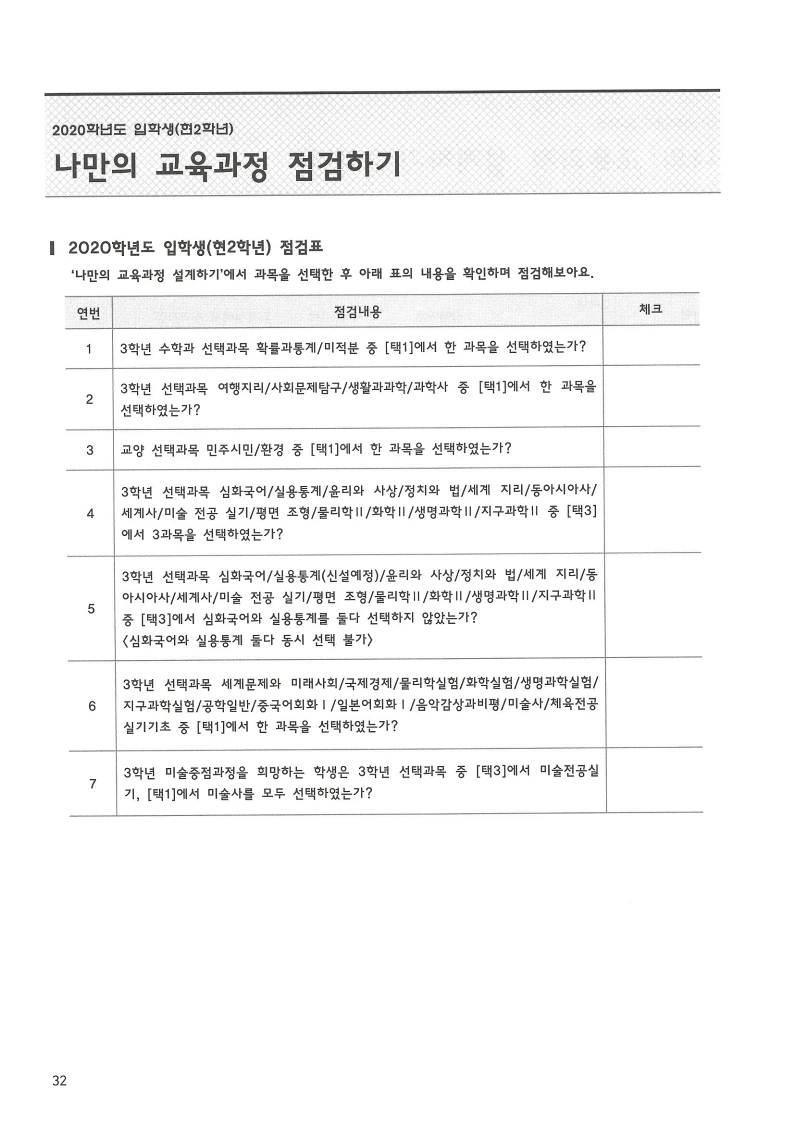 나만의 교육과정 점검하기라는 제목으로 2학년 예술 과목 음악 연주와 미술 창작 중 택 1에서 한 과목을 선택했는가, 2학년 문학과 매체, 현대 문학감상, 기하, 수학과제탐구, 경제수학, 영미문학읽기, 매체 미술 중 택 1에서 한 과목을 선택하였는가, 3학년 교양 선택과목에서 민주시민과 환경 중 택 1에서 한 과목을 선택했는지 점검할 수 있게 했습니다.