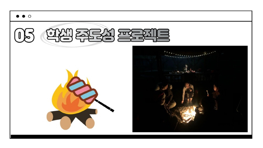 한 학생이 캠프파이어를 하면서 마시멜로를 열심히 구웠는데 너무 열심히 구운 나머지 바지에서 탄내가 났는데 2일 동안이나 바지에서 냄새가 빠지지 않아서 그 학생을 불멍이라고 불렀던 기억이 난답니다. 그 학생은 잘 지낼까요? 아. 지금은 함초롬 반에서 잘 지내고 있답니다.