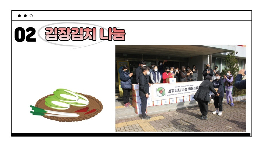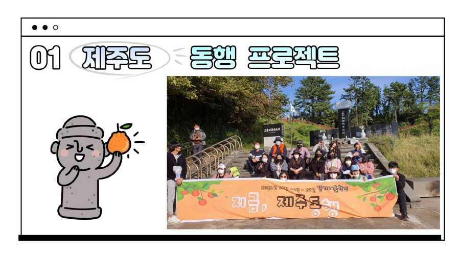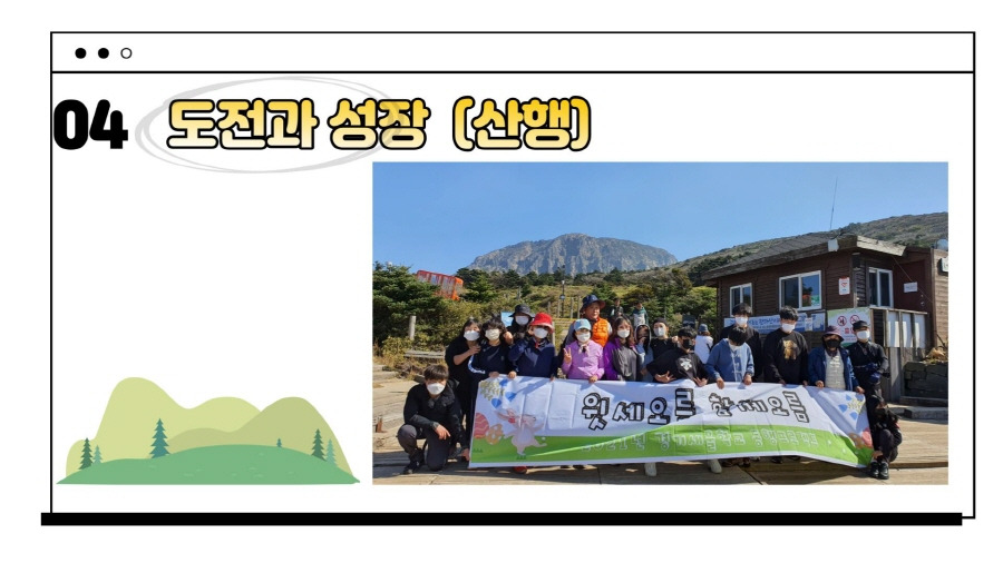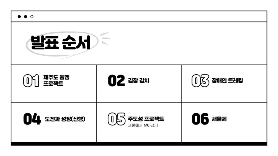 발표 순서는 제주도, 김장김치, 장애인 트레킹, 산행, 학생 주도성 프로젝트, 새울제 등입니다. 자신이 준비한 슬라이드와 함께 에피소드를 이야기합니다.