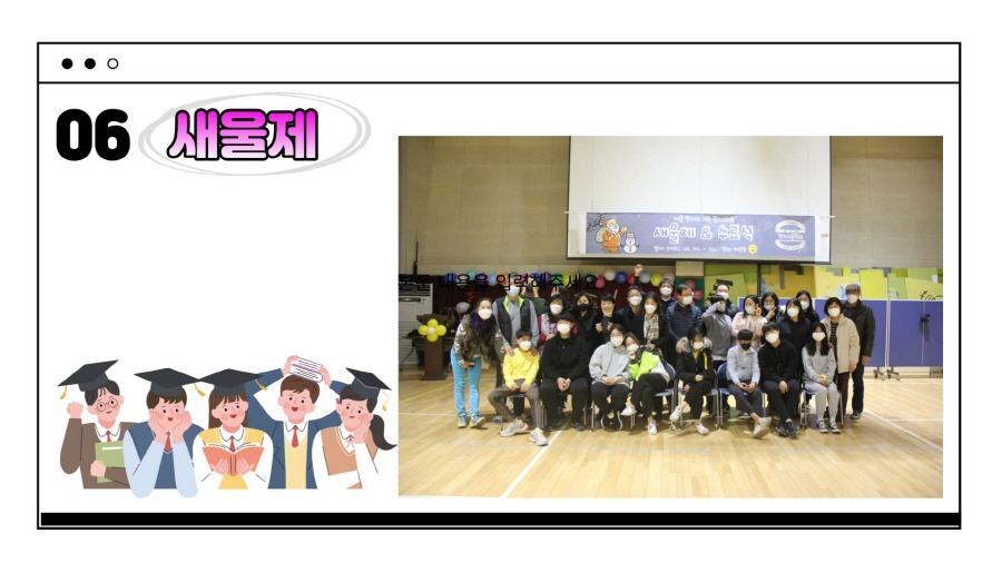 나*이가 이 주제를 정한 이유는 2021년 새울에서의 생활이 정말로 즐거웠고 새울에서의 생활을 통해 자신도 많이 성장했기 때문입니다. 올해도 작년처럼 즐겁고 더 큰 성장을 하여 고등학교 생활도 잘해주길 기대해 봅니다.