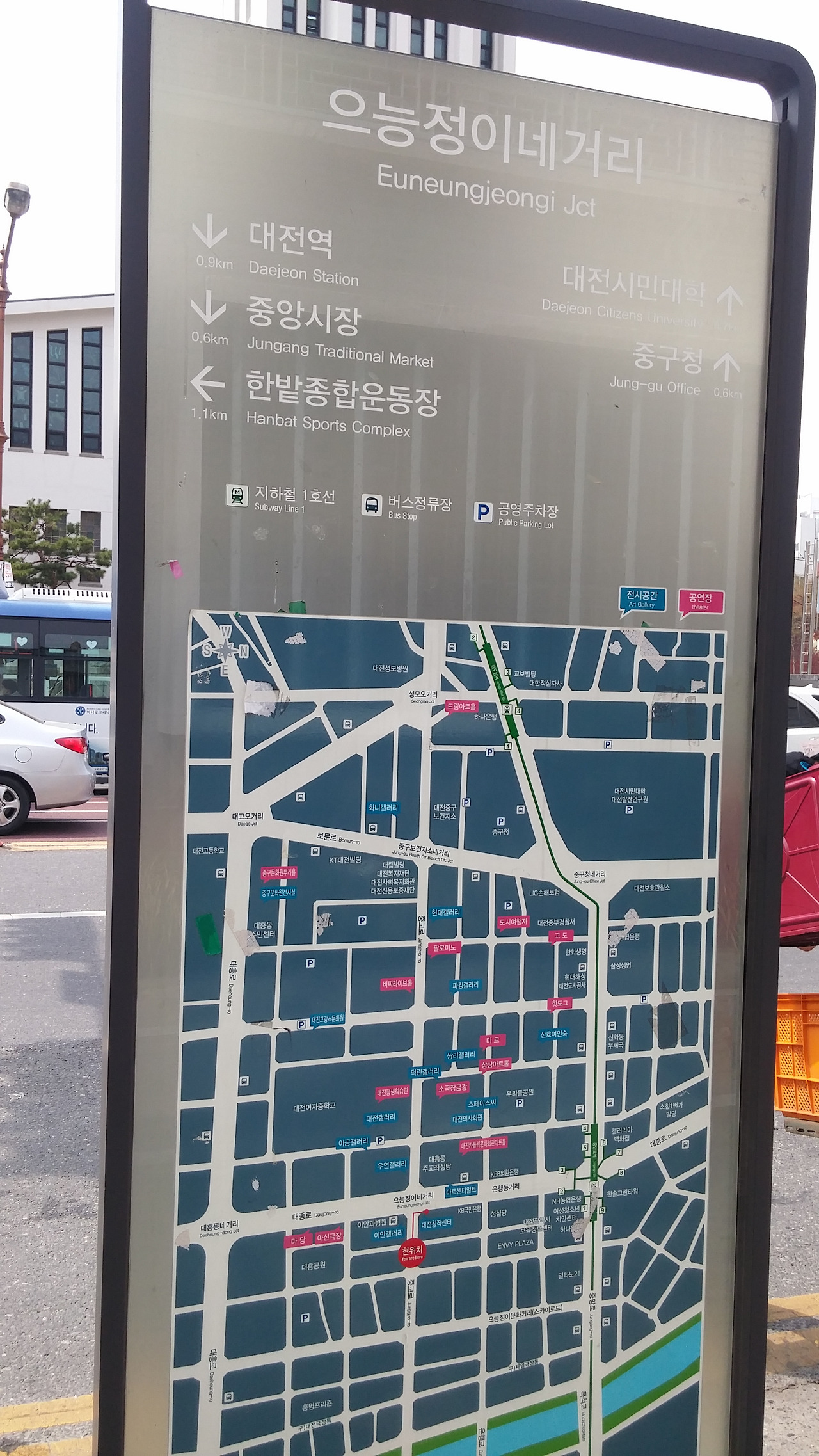 으능정이 안내도. 원도심 재생지역의 가장 핵심적이 곳인데 대부분이 갤러리이다. 아직은 가난한 문화예술인들 중심의 초보적인 한국 도시재생 운동의 한계를 보인다. 결국 가난한 문화예술인들이 성공했다고 해도 다시 쫓겨나는 젠트리피케이션의 악순환이 도시재생 운동의 확대와 함께 더욱 빈번하게 나타나는 현실이 안타깝기만 하다. 이 지역의 최초 운동 단계에서 중심에 섰던 산호 여인숙도 올해 가보니 사라졌다.