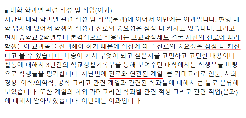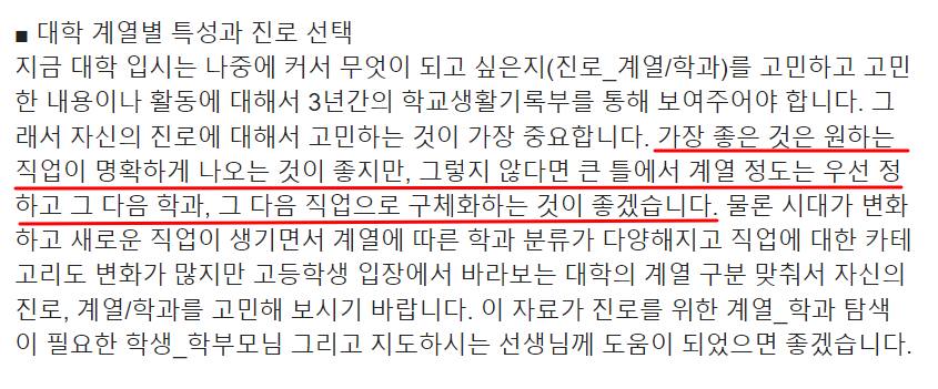 학생부 종합전형에서의 '전공적합성'이라는 것이 평가에 핵심이라며, 진로결정을 빨리 하고 생기부를 그 진로, 즉 진학하고자 하는 학과에 맞추는 것이 좋다고 하기 때문입니다.
