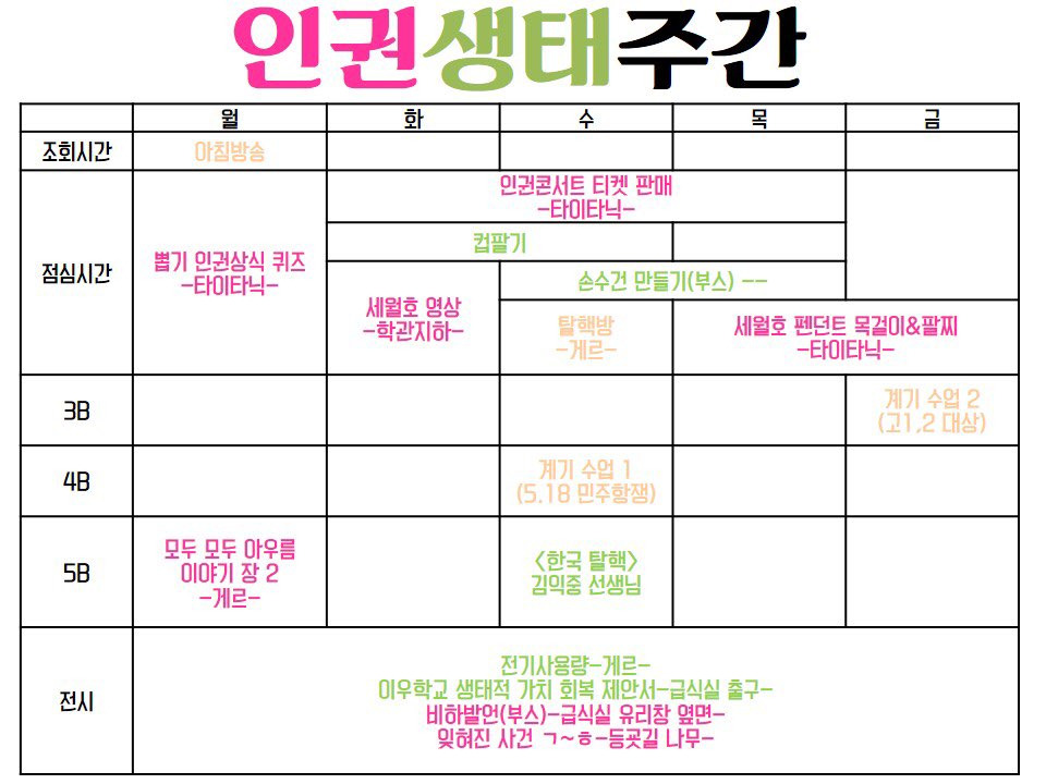 이우학교에서는 매년 5월 한 주간 ‘인권생태주간’을 연다. 5.18을 기점으로 나와 우리의 인권을 다시금 되돌아보자는 의미이다. 인권동아리의 ‘아우름’이 주도하는 행사로, 매년마다 행해진 것은 아니지만 이 시기에 교사들은 계기수업을 준비하며 참여한다. 보통 역사교사인 나 혼자 광주민중항쟁에 대한 수업을 하거나, 때로는 사회과 선생님이나 국어과 선생님, 때로는 정보 선생님과 함께 통합수업을 하기도 한다. 2011년에는 역사교사인 나와 당시 교장직을 맡고 계셨던 사회과 이수광 선생님 그리고 정보 김주현 선생님 함께 <80년의 봄 그리고 2011년>-<광주항쟁 정신을 어떻게 계승ㆍ부활시킨 것인가>-<미디어의 변화와 민주주의>라는 주제로 통합수업을 진행하였다.