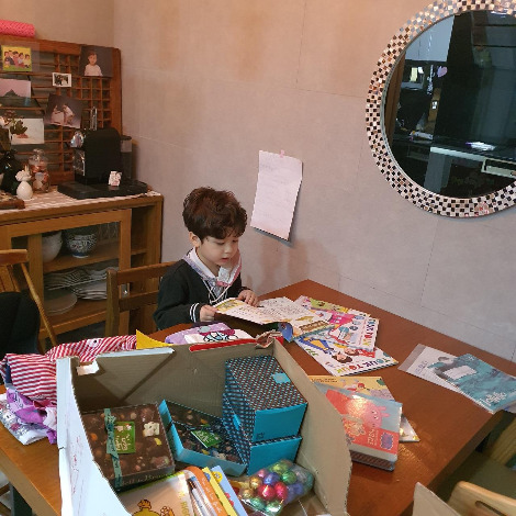 할머니, 할아버지가 보내주신 책을 살펴보는 아이 드디어 소포가 도착했다. 온 가족이 싱글벙글. 어떤 선물이 들어 있을지 잔뜩 기대하며, 소포 상자를 연다. 과연 테트리스 하듯 상자를 속을 꽉꽉 알차게도 채워 보내셨다. 아이들 선물이 대부분이다. 큰 아이는 제일 먼저 책을 꺼내 보고, 둘째 아이는 초콜릿을 종류별로 맛본다. 나는 꼬릿한 냄새가 나는 치즈를 서둘러 냉장고에 넣는다. 내가 가장 기다려왔던 거다. 남편은...... 전부를 살핀다. 상자 속에 담긴 부모님의 그리움과 사랑을 본인의 그것과 겹쳐본다. 그렇게 마음을 데운다.