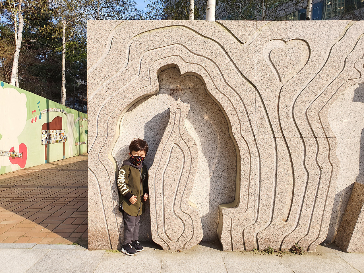 슬금슬금 사람들 눈치를 보며 아이와 마스크를 하고