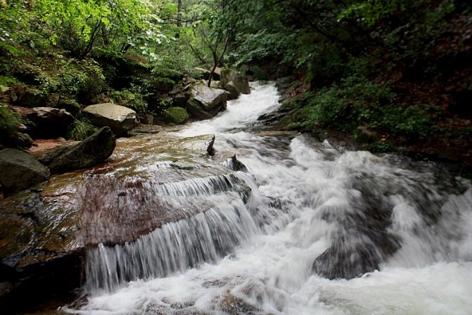 동화사 입구에서 경내로 들어서기 전, 우측으로 내려서면 계곡 위를 건너는 작은 다리 하나를 건너서면 봉화 문으로 이어지는 산길이 있다. 이 길을 따르다가 중간 지점에서 좌측으로 계곡을 들어서게 된다. 무더위를 피해 우거진 녹음 속에 푸른 기운이 가득한 폭포 골로 깊숙하게 들어섰다. 여름 숲 속에서 들려오는 물소리, 바람 소리, 새소리를 들으며 자연을 오롯이 마주하는 순간, 나는 진정한 휴식을 만날 수 있었다. 폭포 골은 수림과 계곡의 암반 등으로 산세가 어우러져 호젓한 휴식을 취하기에 더없이 좋은 풍경을 만들어 내고 있다. 우거진 숲 사이로 계곡의 물줄기가 굽이굽이 흐르며 사계절 내내 마르지 않는다니 얼마나 다행한 일인가 싶다.