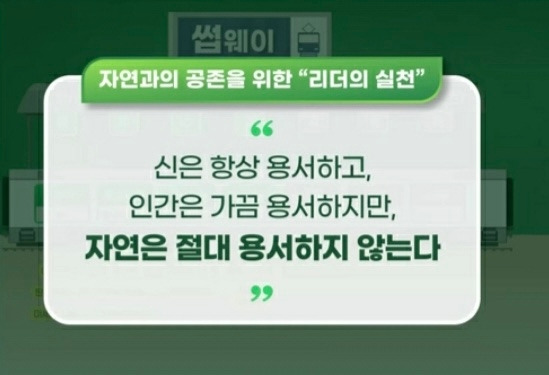 고요한 순간을 즐기며 명상에 빠져 있는데, 스마트폰이 카톡이라고 소리친다. 그녀의 아침 인사와 함께 영상이 올라왔다. 유튜브의 링크를 확인하니 ‘자연은 절대 용서하지 않는다’라는 녹색 문자가 클로즈업되어 눈앞에 다가왔다. 뭐지? 하면서 영상을 열었더니 자연과의 공존을 위한 ‘리더의 실천’이라는 유튜브 강의를 카톡으로 보내왔다. 아침에 5분 투자하면 하루를 어떻게 보낼까 하는 고민을 조금 덜어준다는 말과 함께. 한 사람 한 사람의 작은 실천이 어쩌면 지구를 살릴 수도 있다는 무거운 문자와 오늘도 건강한 하루를 보내자는 인사까지.