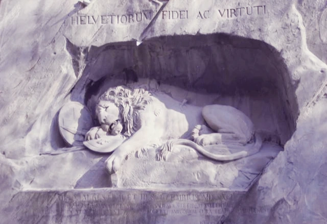 우리 일행은 다시 버스를 타고 루체른에서 빠질 수 없는 관광 코스라고 하는 '빈사의 사자상'이 있다는 루 체르니 공원으로 향했다. 공원 입구를 지나 조금 들어가니 제법 큰 빈사의 사자상이 눈앞에 전개되었다. 조각상을 자세히 보니 머리맡에 창과 방패가 놓여있고 등에는 부러진 창이 박혀 있고 굶어서 초췌해져서 죽어가는 사자상이었다. 빈사의 사자상은 프랑스혁명 당시, 마리 앙투아네트와 루이 16세가 있던 궁전을 지키던 스위스 용병 전사자 786명을 기리기 위해 만들어진 조각상이라고 한다. 그래서 스위스 용병을 상징하는 사자를 조각하였는데 사자 등에 칼이 찔려 고통스러운 최후를 맞이하는 모습이 묘사되어있었다. 당시 스위스는 온통 산악지형이라 먹고살기가 어려워 서 자신의 가족 생계와 나라를 지키기 위해 전사들이 다른 나라의 용병으로 가서 왕실들을 보호하며 돈을 벌었다고 한다. 이 조각상을 자세히 보면 사자에 등허리에 창이 꽂혀 사자가 혀를 벌리고 죽기 일보 직전의 형상을 조각하여 스위스 병사들을 기리는 애틋한 사연이 깃들어 있는 조형물로 알려져 있었다.