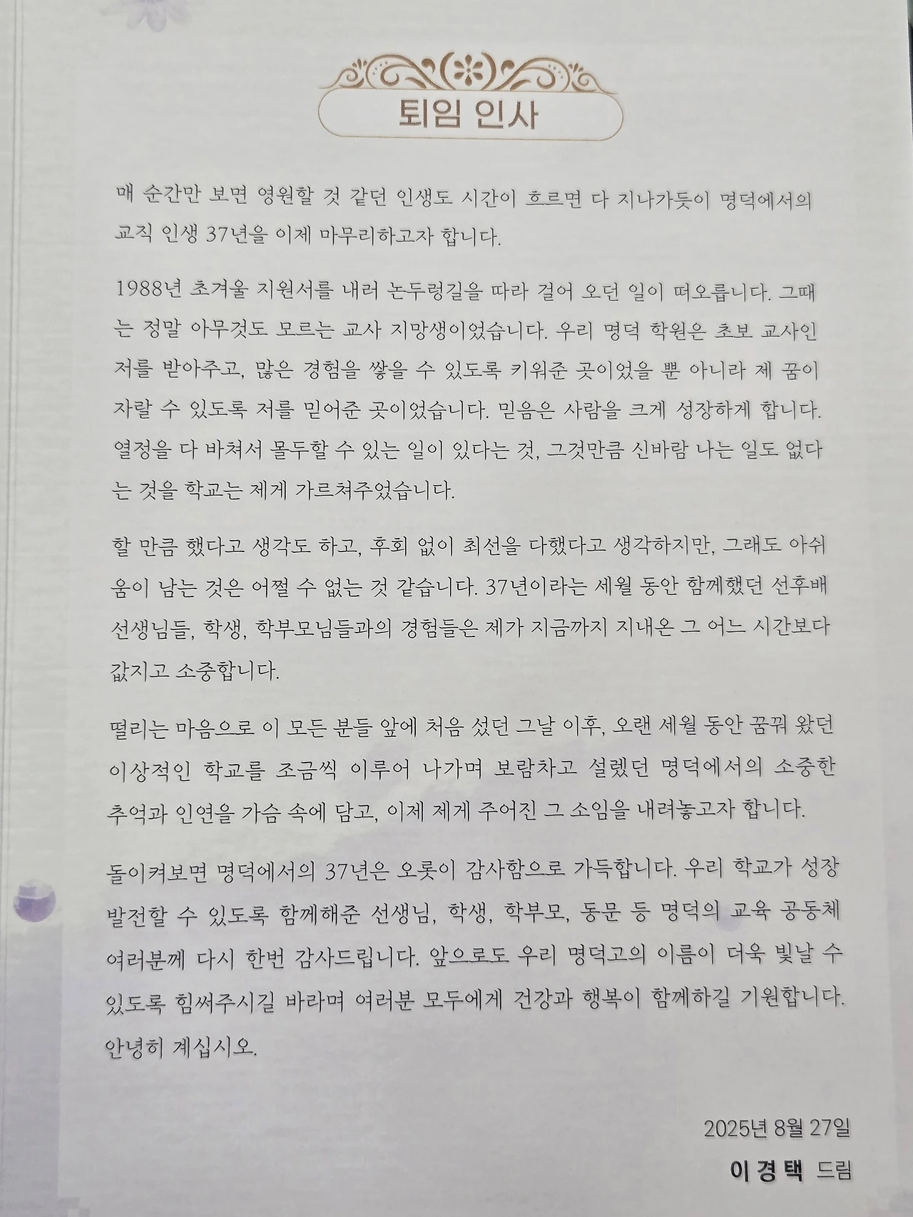 37년 동안 고교 교사로 외길을 걸어오신 경택 형님의 삶이 새삼 존경스러웠다.