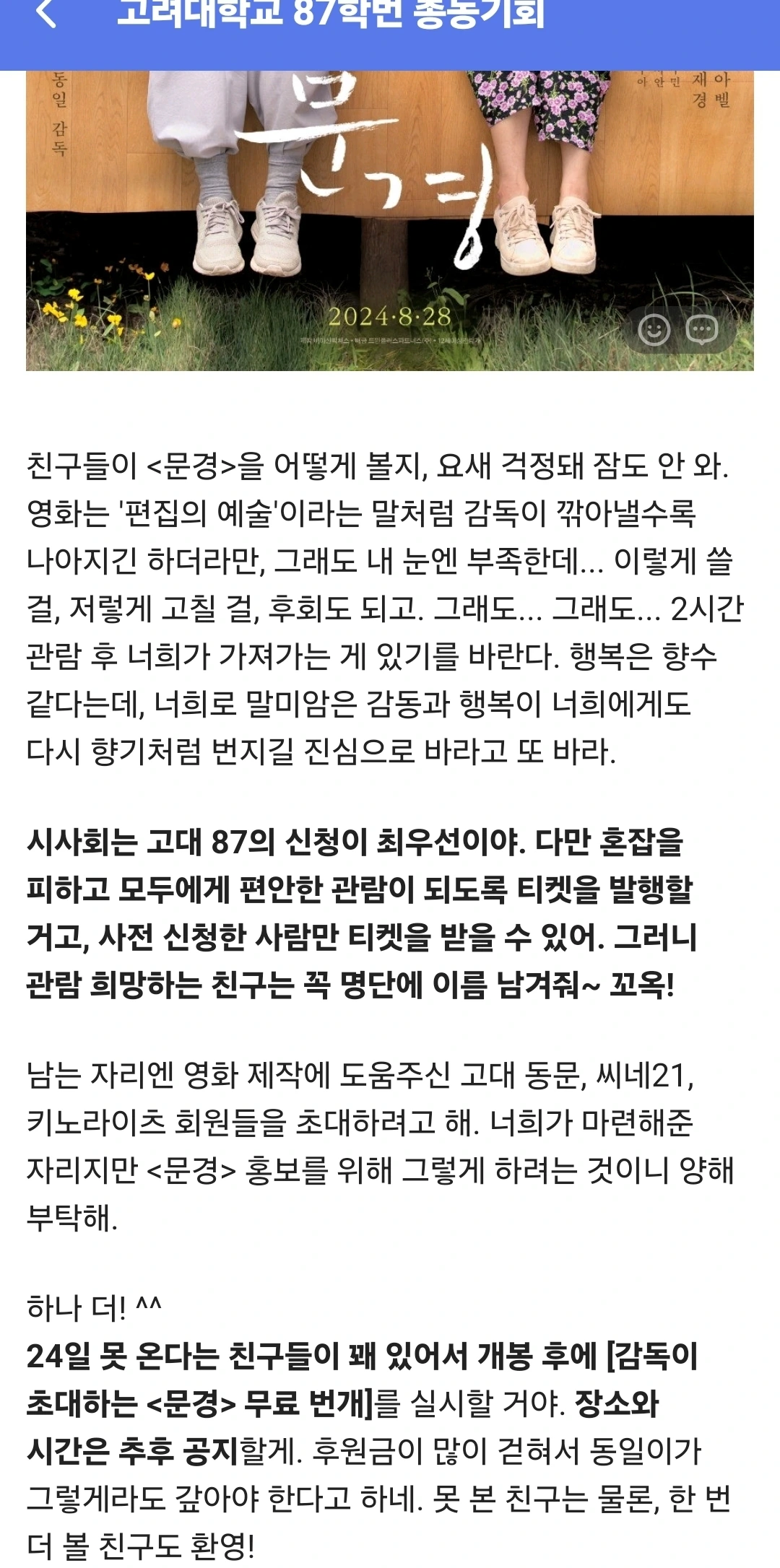 87학번 동기들이 십시일반 후원금을 모아서 영화 '문경' 시사회를 했다. 대학동기들 81명이 함께 관람했다.