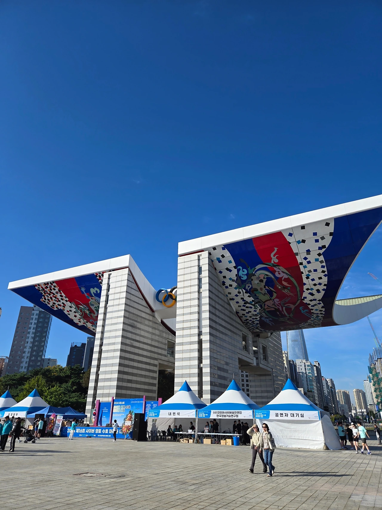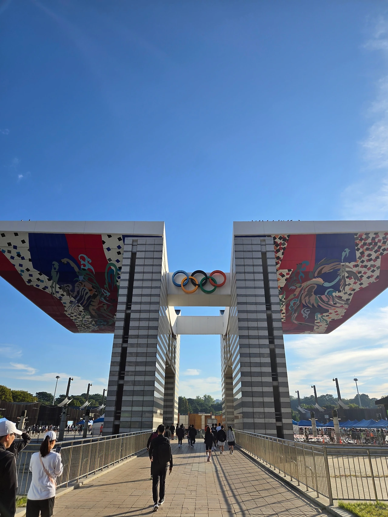 올림픽 공원 평화의 광장에는 운동화와 운동복을 입은 건강한 사람들