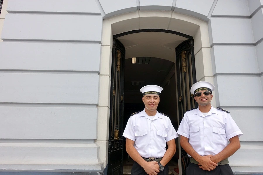 그렇게 해군사령부 앞에서 보초를 서고 있던 해군 오빠 2의 옷을 빌려 입고 발파라이소 여행이 시작되었다. 사진 속 오른쪽 선글라스 쓴 분. 내가 처음 만난 모르는 이의 옷을 덥석 입게 될 줄일이야. 그것도 칠레 해군에게 빌린 옷이라니!
