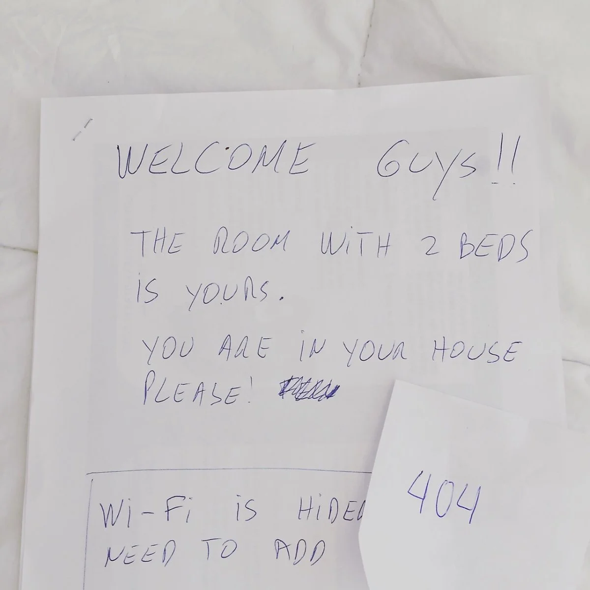 호평 일색인 판초의 레퍼런스가 대번에 이해되는 간단하고도 반가운 메모였다. 판초가 말하는 방은 커다란 창문이 있는 방이었는데, 양쪽으로 두 개의 싱글 침대가 각각 놓여있었다. 크고 넓은 창 덕분에 채광이 좋아 온종일 밝고 기분 좋은 곳이었다. 판초네 집은 방이 3개였는데, 하나는 판초가 쓰는 방이었고 나머지 두 개가 게스트룸으로 쓰이고 있었다. 게스트룸 1에는 먼저 온 또 다른 카우치서핑 게스트인 호주인 커플, 루시와 제이크가 묵고 있었다. 그리고 새로 온 나와 독일인 여행자 알렉사가 작은 방에 묵었다. 알렉사는 이번이 첫 산티아고 여행이었는데, 자신의 친구가 먼저 판초의 집에 머물렀던 멋진 경험으로 산티아고 판초네를 소개해주어 오게 된 것이었다. 이렇게 총 5명이 판초네 집에 함께 지내게 되었다.