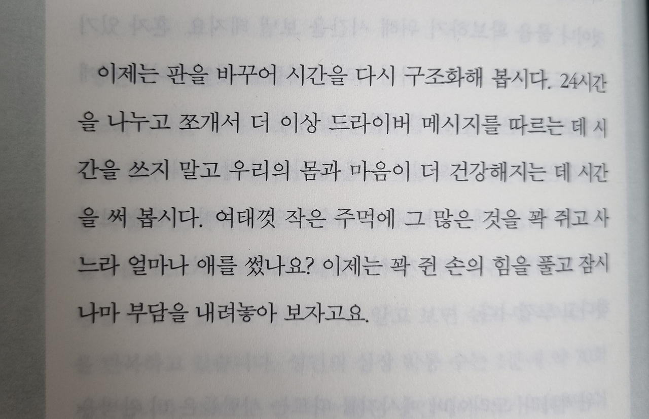 책 속에서 몰아내기 작업은 3단계로 소개되어 있다. 첫 번째 단계는 내 안에서 들리는 비판적 부모 자아, 나에게 강박관념을 갖게 하는 드라이브를 알아채는 것이다. 그러나 그것을 알아채는 첫 단추부터가 쉽지 않았다. 열심히 기억을 더듬어 몇 가지 메시지를 발견했다면, 두 번째는 그것을 반박해 보는 것이다. 그것은 첫 번째 단계보다 더 쉽지 않았다. 책에서 언급된 것처럼 부모 자아에 맞서 허가 또는 반박을 하는 것은 너무 낯설고 비현실적으로 느껴져서 불신이 생기곤 한다. 예를 들어, 비판적 부모에 맞서서 ‘너무 나 자신을 몰아붙이지 않아도 괜찮아.’라고 허용을 하려고 하니 ‘그렇게 부족한 점이 많은데 뭐가 괜찮다는 거니? 나태해지지 말고 계속 발전해야지.’라며 불호령이 떨어지는 것이다. 그래도 애써 그 목소리를 무시하며 몰아내기의 3단계로 향해보았다. 3단계는 행동전략을 세우고 자유로운 아이 자아를 풀어주기 위해 나를 위한 말 하기를 하는 것이다. 나는 결국 아무것도 써내지 못했다. 내 아이 자아는 비판적 부모 자아에게 꽤 많이 억눌려 주눅이 든 상태인가 보다.