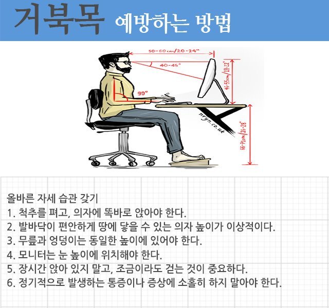 스마트폰 및 컴퓨터를 오래 사용하는 대부분의 사용자들은 거북목 혹은 일자목을 조금씩 가지고 있습니다. 현대인의 전염병이라고 할 수 있으며, 휴대폰을 소유한 사람들의 절반 이상이 이러한 증상을 가지고 있다고 합니다.