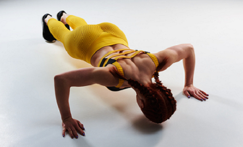 바닥에 어깨너비보다 더 넓게 손바닥을 대고, 상체, 엉덩이, 다리가 구부러지지 않게 쭉 펴서 몸의 라인을 이루도록 합니다. 그리고 팔을 굽힐 때에는 어깨가 팔꿈치와 같은 라인에 있을 때 멈추고, 팔을 다시 곧게 펴주면서 몸 전체가 원래 자세로 돌아오면 1회가 완성됩니다. 1분 동안 반복 운동하세요.