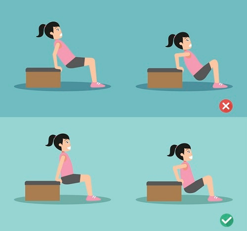 벤치 딥스는 어깨에 무리가 갈 수 있기 때문에 주의해야 하는데요. 팔꿈치를 편 상태로 팔을 고정하여 시작해야 하며, 위아래로 반복 움직임을 가져가야 합니다. 먼저 벤치에서 조금 떨어져 손을 올려놓습니다. 이후 3-4 걸음 정도 멀어집니다. 상체는 곧게 뻗은 모습을 유지하며, 벤치에 맞춰 무릎과 팔꿈치를 구부리고 몸 전체를 바닥을 향해 움직이세요. 팔꿈치를 90도 각도까지 되도록 내려준 후, 기존의 자세로 돌아옵니다.