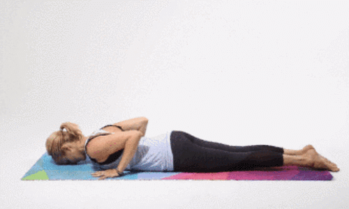 바닥에 엎드려 무릎을 굽히고, 손으로 발목을 잡으세요. 그리고 발을 손으로 누르고, 무릎은 엉덩이 넓이만큼 벌립니다. 그런 다음 땅에서 상체를 들어 올립니다. 자세를 유지하며, 최대한 호흡하세요. 이러한 동작을 1분 동안 반복합니다.