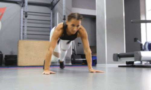 버피 동작에 푸시업을 추가하여 운동 강도를 높일 수 있는데요. 똑바로 서서 시작하며, 바닥에 엎드리는 플랭크 자세를 만듭니다. 그리고 푸시업을 1회 실시한 후, 다리를 점프하여 가슴 방향으로 모아줍니다. 그런 다음 일어서서 손을 공중으로 뻗으면서 높이 점프한 후, 다시 바닥에 엎드려서 플랭크 자세와 푸시업으로 이어지는 동작, 서서 점프하는 동작을 1분 동안 반복합니다.