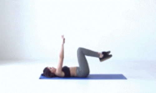 바닥에 등을 대고 눕고, 무릎을 들어서 90도 각도로 구부린 후, 정강이와 바닥이 평행을 이루도록 합니다. 그리고 팔은 천장 방향으로 쭉 뻗은 후, 왼쪽 팔을 뒤통수 쪽으로 뻗으면서 동시에 오른쪽 다리를 쭉 뻗습니다. 그런 다음 뻗은 팔과 다리가 원래 자세로 돌아오면, 이번에는 오른쪽 팔과 왼쪽 다리로 반복합니다. 1분 동안 팔과 다리를 교차하며 진행하세요.