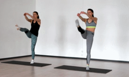 바닥에 서서 손을 가슴 앞으로 뻗어 원 모양을 만듭니다. 그리고 오른발을 앞으로 차서 바닥과 평행하게 만들었다가 원위치하고, 손을 엉덩이 뒤로 맞잡아 왼발을 앞으로 차서 바닥과 평행하게 만들었다가 원위치합니다. 30초 동안 반복 후, 다리의 순서를 바꿔서 30초 반복하세요. 운동 중에는 무릎을 최대한 펴고, 속도를 조절하여 운동 강도를 높일 수 있습니다.
